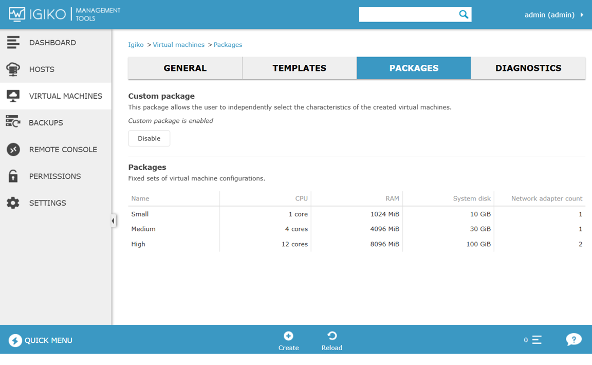At the same time, there is a special Custom package, the permissions to which give the user the opportunity to create virtual machines with an arbitrary set of characteristics.