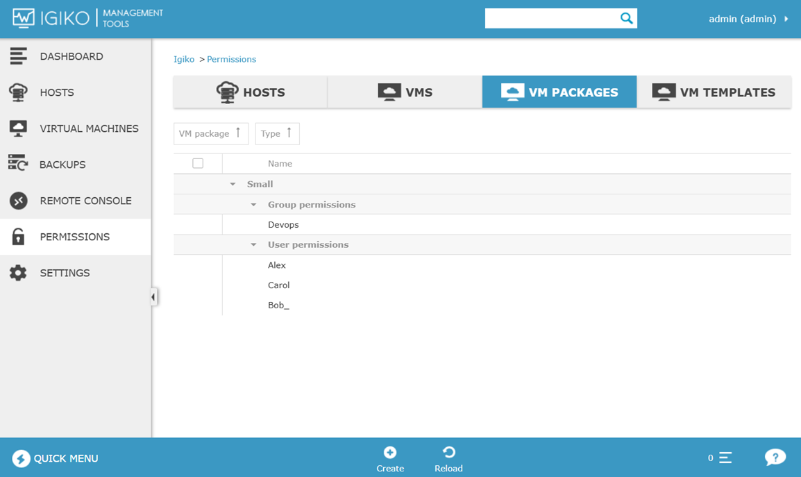 To configure the permissions to VM packages, go to the Permissions page, using the menu on the left, and select VM packages at the top.